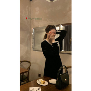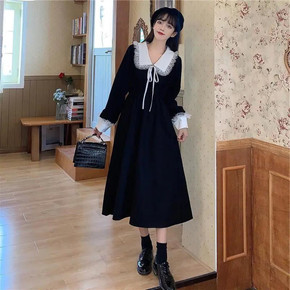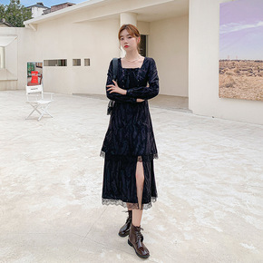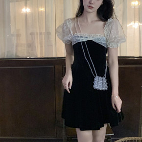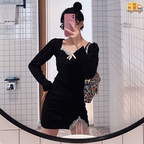 宫廷风方领蕾丝花边拼接开叉小黑裙气质显瘦长袖连衣裙...