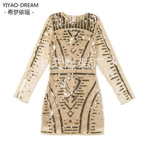 欧美秋冬新款修身包臀聚会名媛气质亮片重工钉珠纱网打...