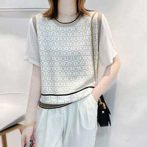 大码字母提花冰丝针织衫2022夏新款宽松透气撞色短...