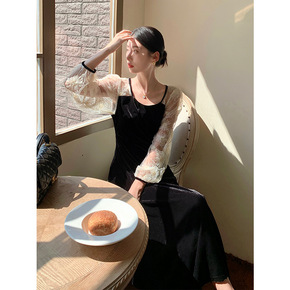 爱西里2022秋季新款长袖高腰撞色金丝绒连衣裙绣花...