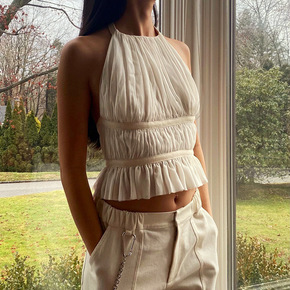 欧美女装2022夏季新款镂空拼接一字领裹胸系带挂脖...