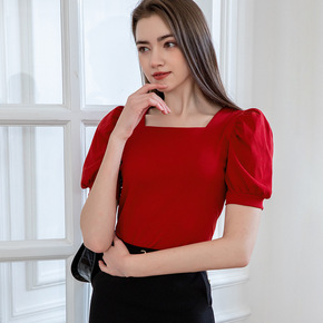 2022年夏季短袖T恤衫女潮流修身上衣纯色泡泡袖纯...