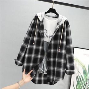 【现货】春秋季格子衬衫女 复古港味ins宽松连帽开...