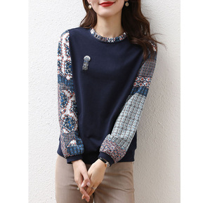 欧货春秋新款民族风宝蓝色木耳复古印花假两件拼接in...