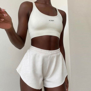 时尚休闲纯色基础运动套装字母印花无袖露脐背心高腰三...