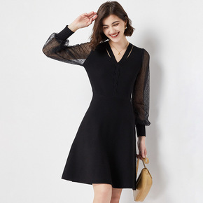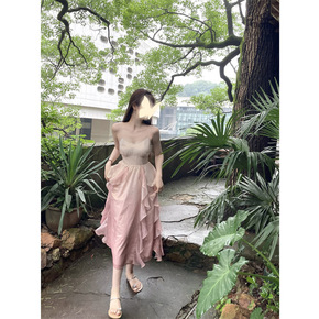 2022夏季新款气质高腰显瘦镂空方领拼接针织长款连...
