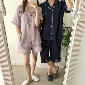 女士夏季新款短袖长裤睡衣绉布棉家居服套装女士居家服...