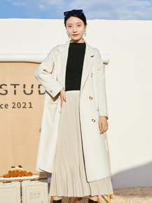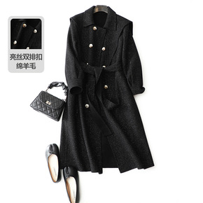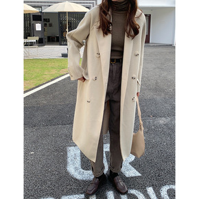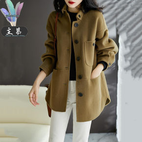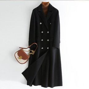 绵羊毛双面呢大衣女2021秋冬韩版双排扣翻领长袖中...