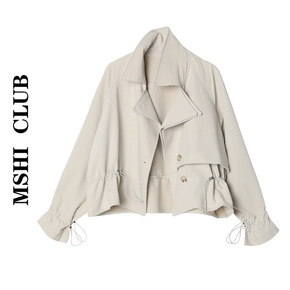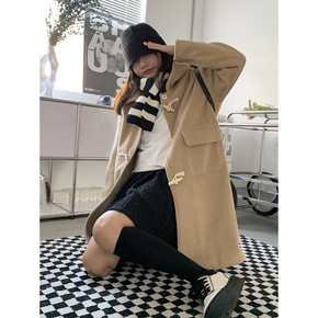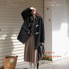 一沫制衣/卡其翻领牛角扣毛呢大衣女夹棉外套学院风宽...