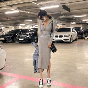 紧身显瘦中长裙包臀连衣裙女开叉连帽打底裙长袖V领卫...