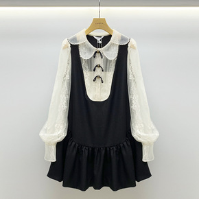 2021冬季新款女装甜美荷叶边裙钩花娃娃领拼接网纱...
