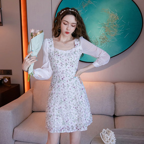 2022春秋新款假两件碎花连衣裙时尚韩版宽松显瘦遮...