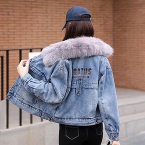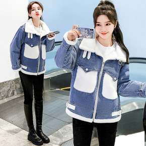 批发秋冬加绒加厚牛仔外套女短款秋冬季韩版宽松棉服羊...