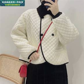 实拍2021冬季新款法式复古菱格拼色小香棉衣短款外...
