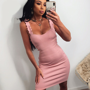 INS欧美新款女装木耳边纯色包臀裙修身性感坑条针织...