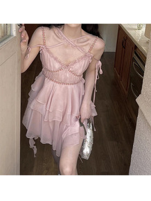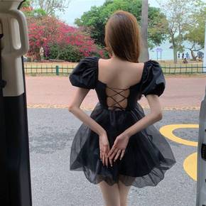 桃心领连衣裙夏季网纱露背连衣裙泡泡袖2022女新款...