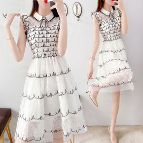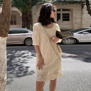 6316韩国东大门爆款立体花瓣蕾丝短袖连衣裙高腰宽...