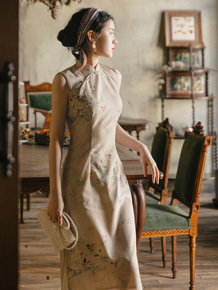实拍 日常显瘦枝上蝶复古改良旗袍修身开叉立领无袖连...