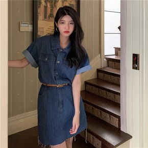 复古气质收腰显瘦牛仔短袖连衣裙2022新款夏小众小...