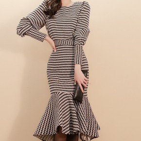 优雅女人味条纹羊毛针织连衣裙秋冬新款气质抽绳收腰A...