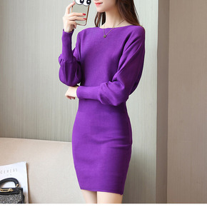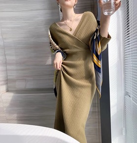 气质女装2022秋冬修身显瘦打底针织连衣裙V领名媛...