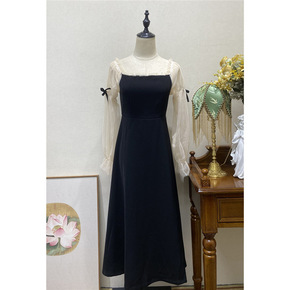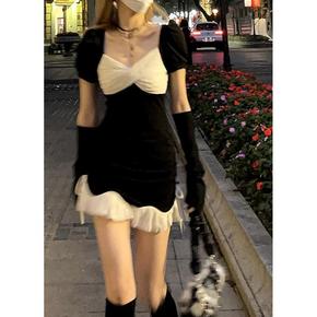 2022春夏新款黑色袖套连衣裙拼接荷叶边设计高腰修...