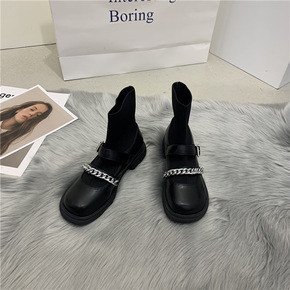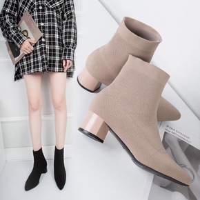 2022新款短靴女弹力针织百搭韩版马丁靴尖头粗跟低...