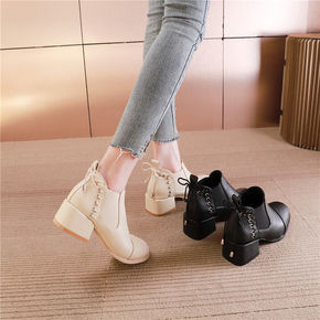 2022春秋冬季欧美高跟粗跟短靴裸鞋英伦风复古系带...