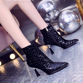 名媛编织尖头小短靴女细跟2022年秋冬季新款高跟鞋...