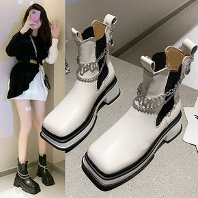 切尔西靴女2021新款英伦金属链条短靴方头松糕厚底...