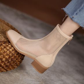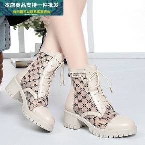 春夏新款真皮女靴镂空网鞋粗跟短靴高跟时尚蕾丝透气网...