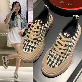 两穿帆布鞋女2021秋冬新款千鸟格加绒休闲系带平底...
