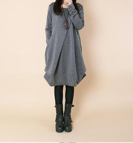 2019秋冬新款韩版女装大码宽松褶皱圆领长袖连衣裙...