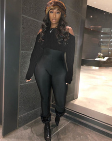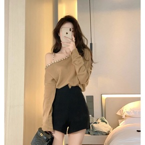2021秋装新款设计感宽松水钻露肩毛衣+休闲高腰阔...