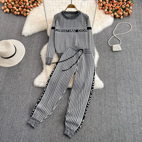 大码女装春季套装女年新款纯欲风棋盘格针织毛衣休闲裤...