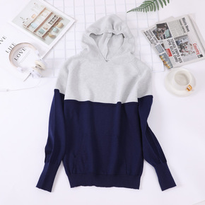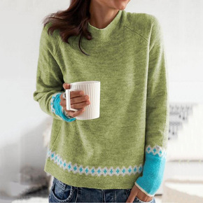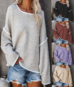 欧美新款女装 时尚圆领撞色针织衫 宽松套头长袖毛衣...