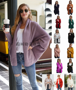 亚马逊秋冬爆款蝙蝠袖时尚宽松大码长款针织开衫毛衣女...