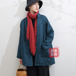 亚麻棉中式立领盘扣棉袄秋冬气质纯色对襟宽松夹棉外套...