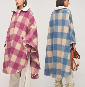 22秋冬装新款复古气质格纹斗篷翻领格子毛呢披肩外套...
