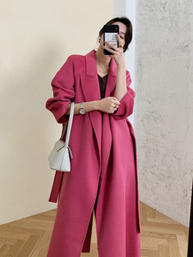 玫红色粉色双面羊绒大衣女长款2021年秋冬新款双面...