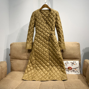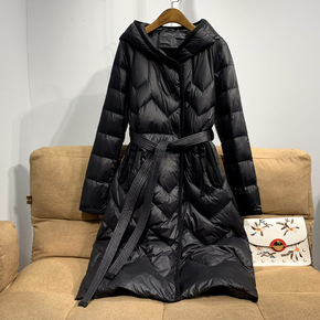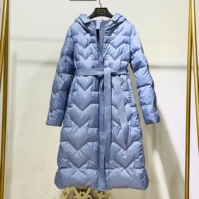 2021设计长款过膝羽绒服女连帽系带收腰白鸭绒外套...