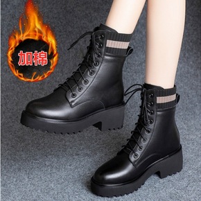马丁靴女2021年冬季新款加绒单靴系带厚底英伦风拉...