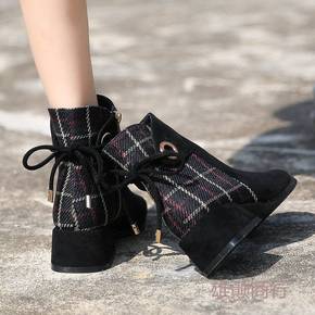 2021冬季新款粗跟短靴法式淑女复古蝴蝶结绒面及踝...