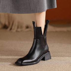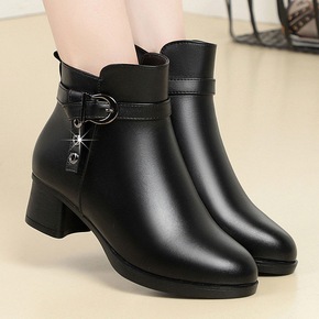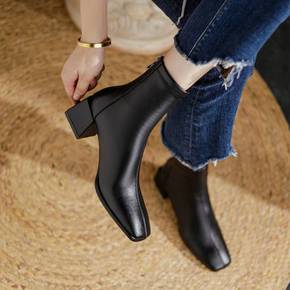 粗跟短靴女秋冬季2021新款女士加绒皮鞋真皮皮靴马...