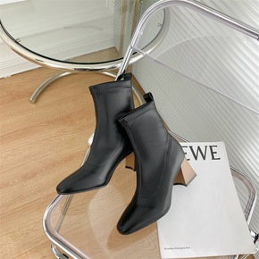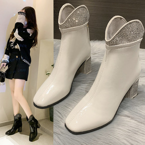 秋冬新款圆头高跟靴子女欧美后拉链粗跟靴子简约镶钻中...