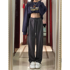 灰色阔腿裤女秋冬加绒高腰宽松直筒休闲裤抽绳卫裤束脚...