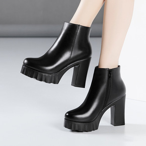 高跟粗跟马丁靴女2020秋冬厚底防水台加绒大码短靴...
