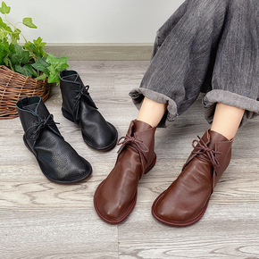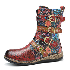 跨境欧美现货手工擦色拼接复古碎花舒适平底休闲女靴...