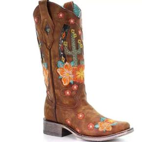 2021年秋冬女士圆头彩色绣花低跟拼色女靴40-4...