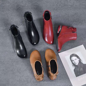 头层牛皮粗跟小短靴女靴低跟圆头纯色单靴拉链蝴蝶结秋...